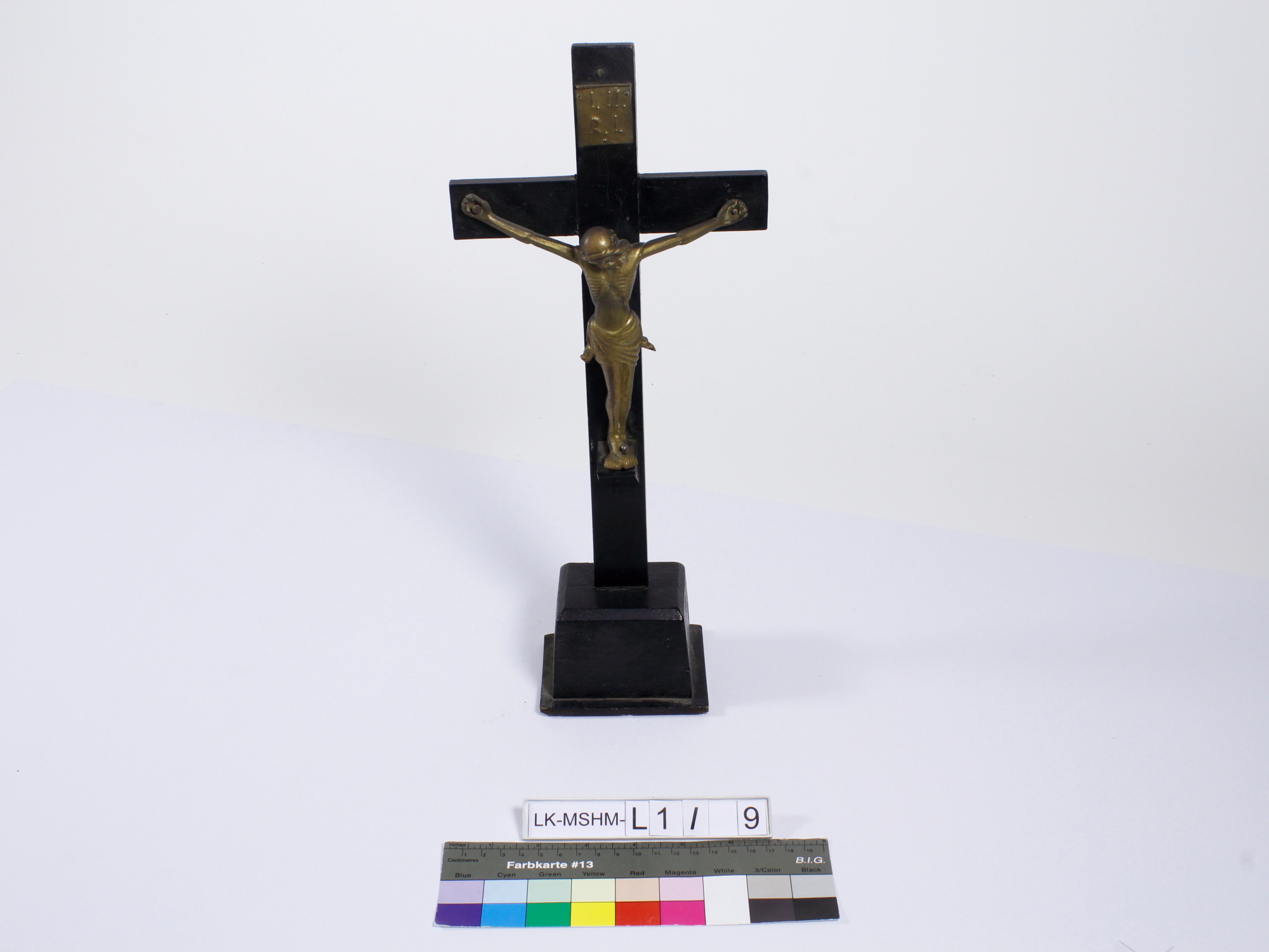 Kruzifix aus schwarz lackiertem Holz. Korpus Christi und INRI-Tafel aus Messing.