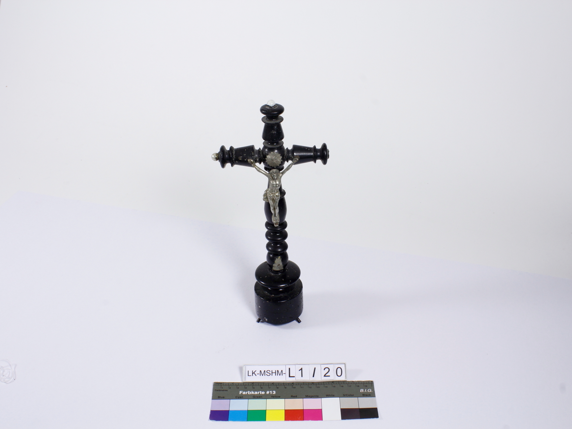 Kleines Standkruzifix mit reich profilierten Kreuzbalken. Beschläge aus Blei-Zinn-Legierung und Porzellan.