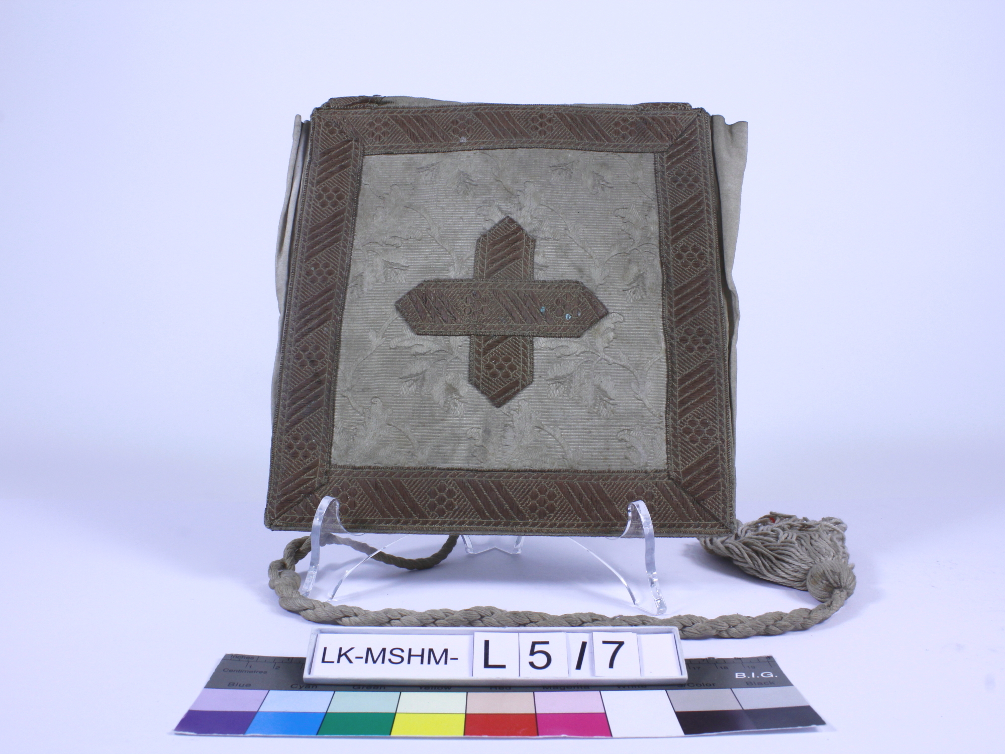 Für das Tuch zum Putzen des Kelches. Brokat mit Borte eingefasst, Kordel mit Quaste. Aus der Bürgersdorfer Kirche.