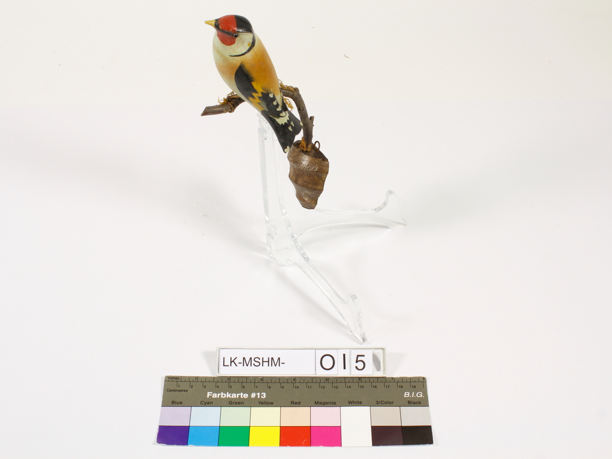 geschnitzter Holzvogel auf einem Ast sitzend