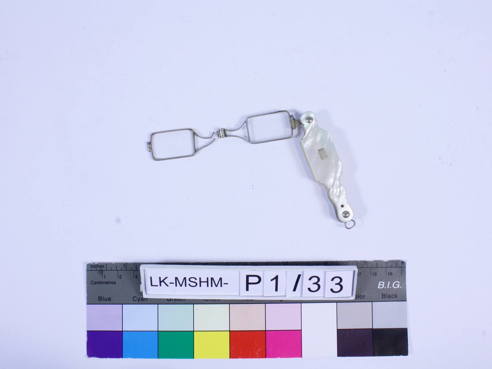 Kleine Anhängerlorgnette mit Gehäuseschalen aus Perlmutt und Klappmechanik (defekt).