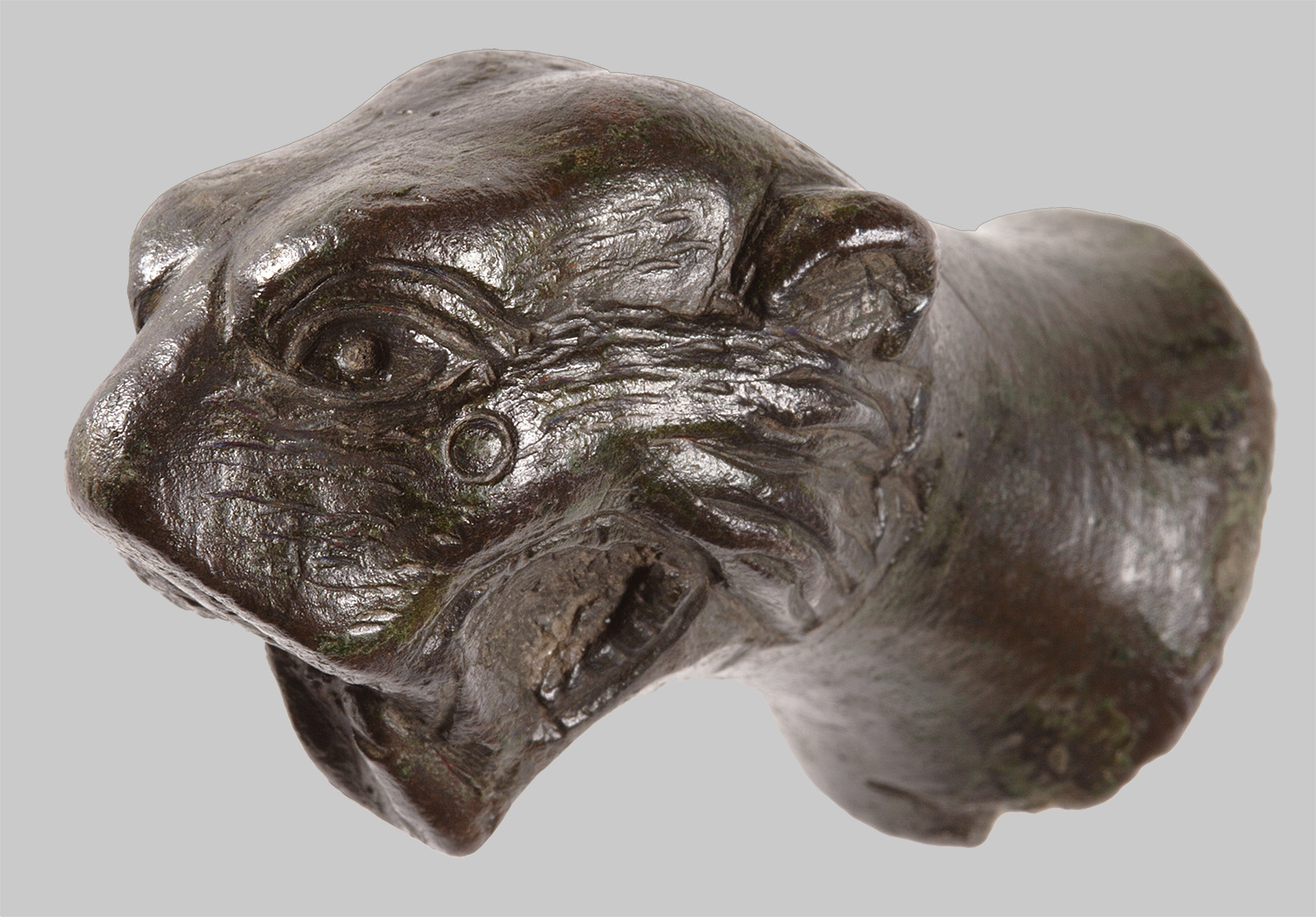 Der Abschluss der Tülle ist im Querschnitt rund und innen hohl. Der Kopf ist plastisch modelliert. Das Maul mit den großen Eckzähnen ist weit geöffnet, die Schnauze vorne abgeflacht. Die Pupillen sind durch kleine gebohrte Löcher, die Augenlider und Brauen durch feine Wülste gekennzeichnet. Das Fell ist durch feine Meißelarbeit und eingepunzte Ringe angedeutet.