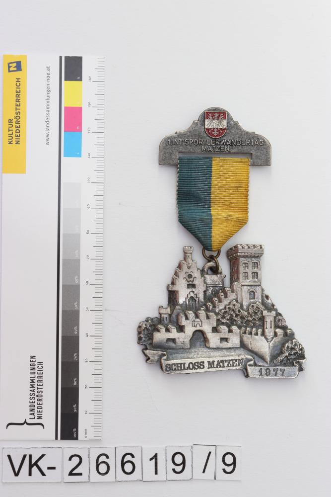 Abzeichen an einem blau-gelben Ripsbändchen, mit Darstellung von Schloss Matzen und Beschriftungen: "1. INT. SPORTLERWANDERTAG MATZEN", "SCHLOSS MATZEN 1977".