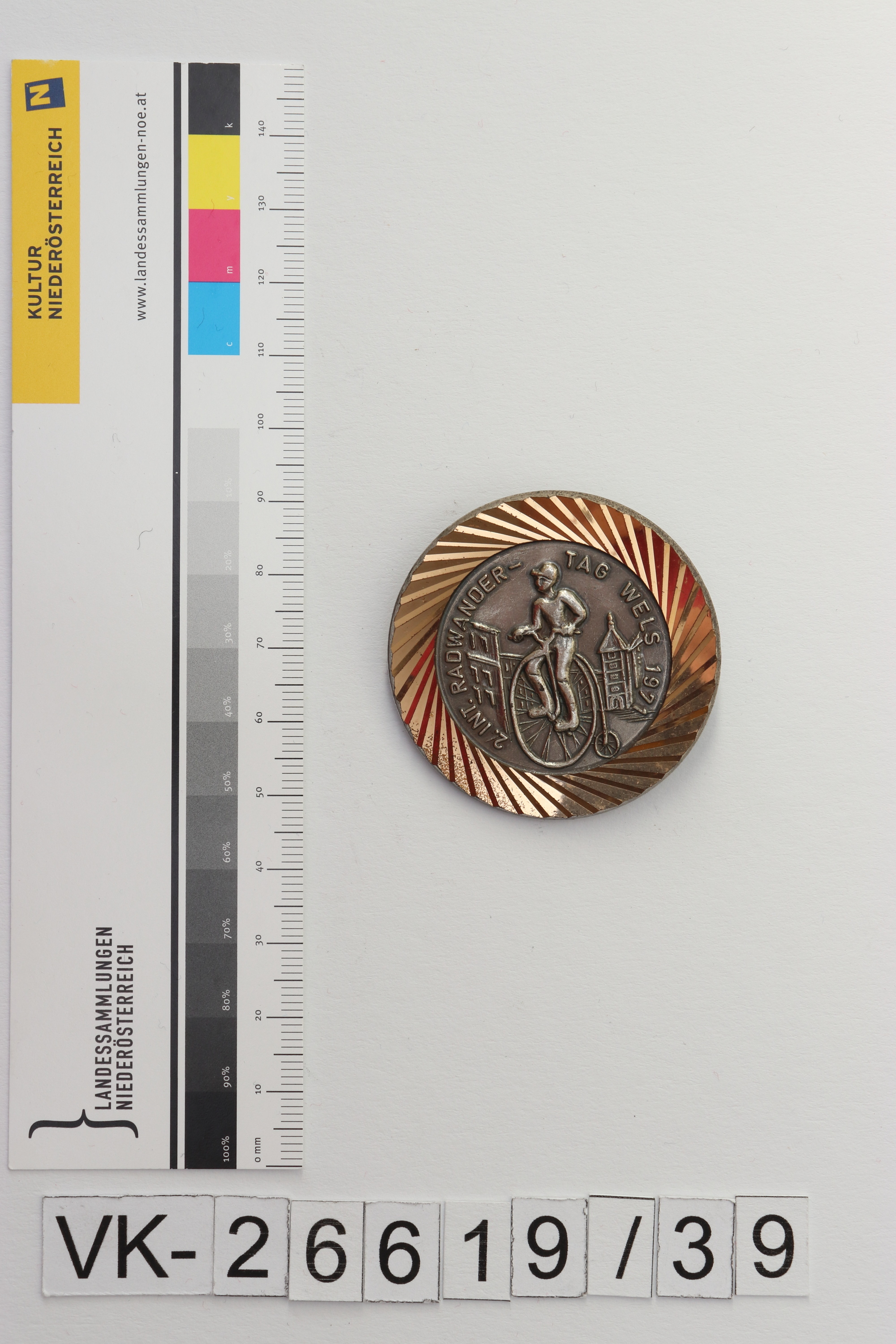 Rundes Abzeichen mit Hochradfahrfer und Beschriftung: 2. INT. RADWANDERTAG WELS 1971".