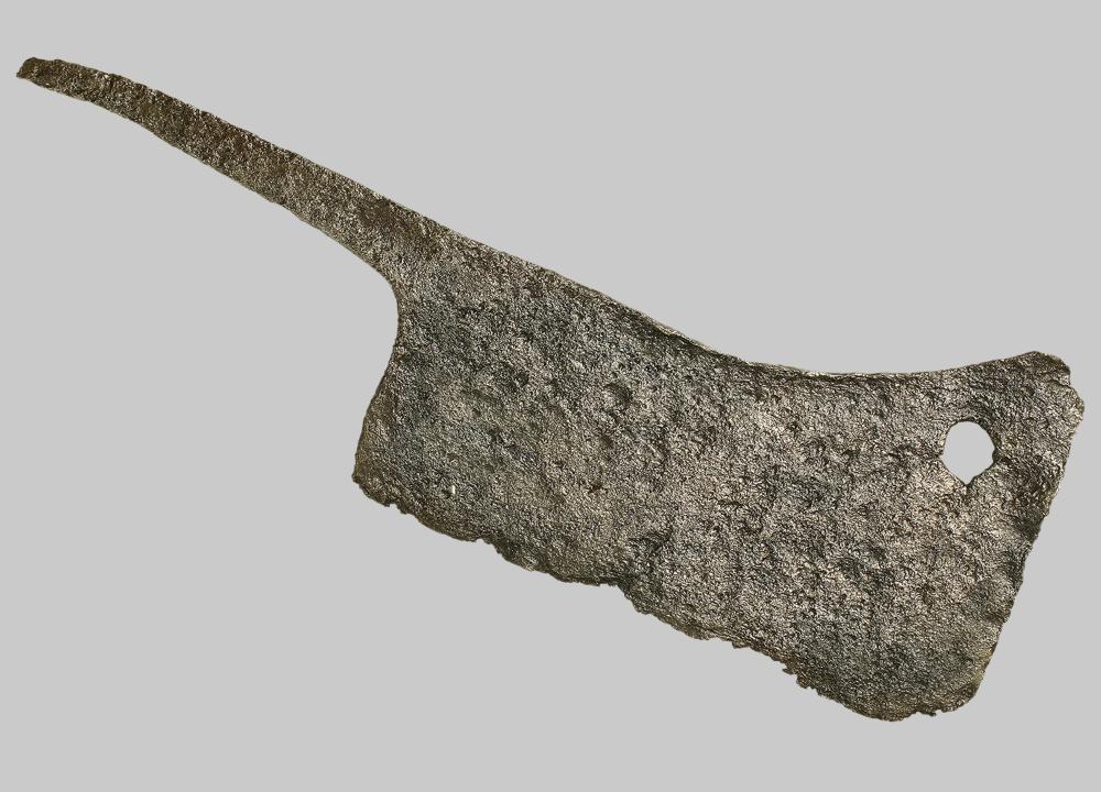 Massives Messer mit rückenständiger Griffangel, geschwungenem Rücken, fragmentierter Schneide und ovalem Loch in der Klinge.