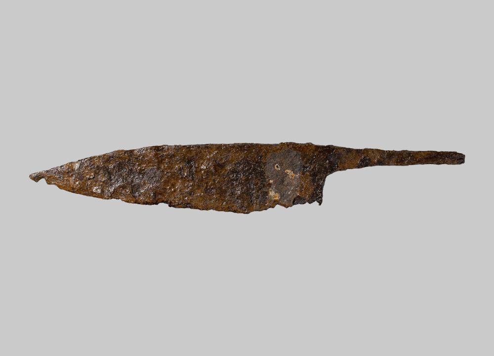 Messer mit rückenständiger Griffangel, gebogenem Rücken und fragmentierter Schneide.