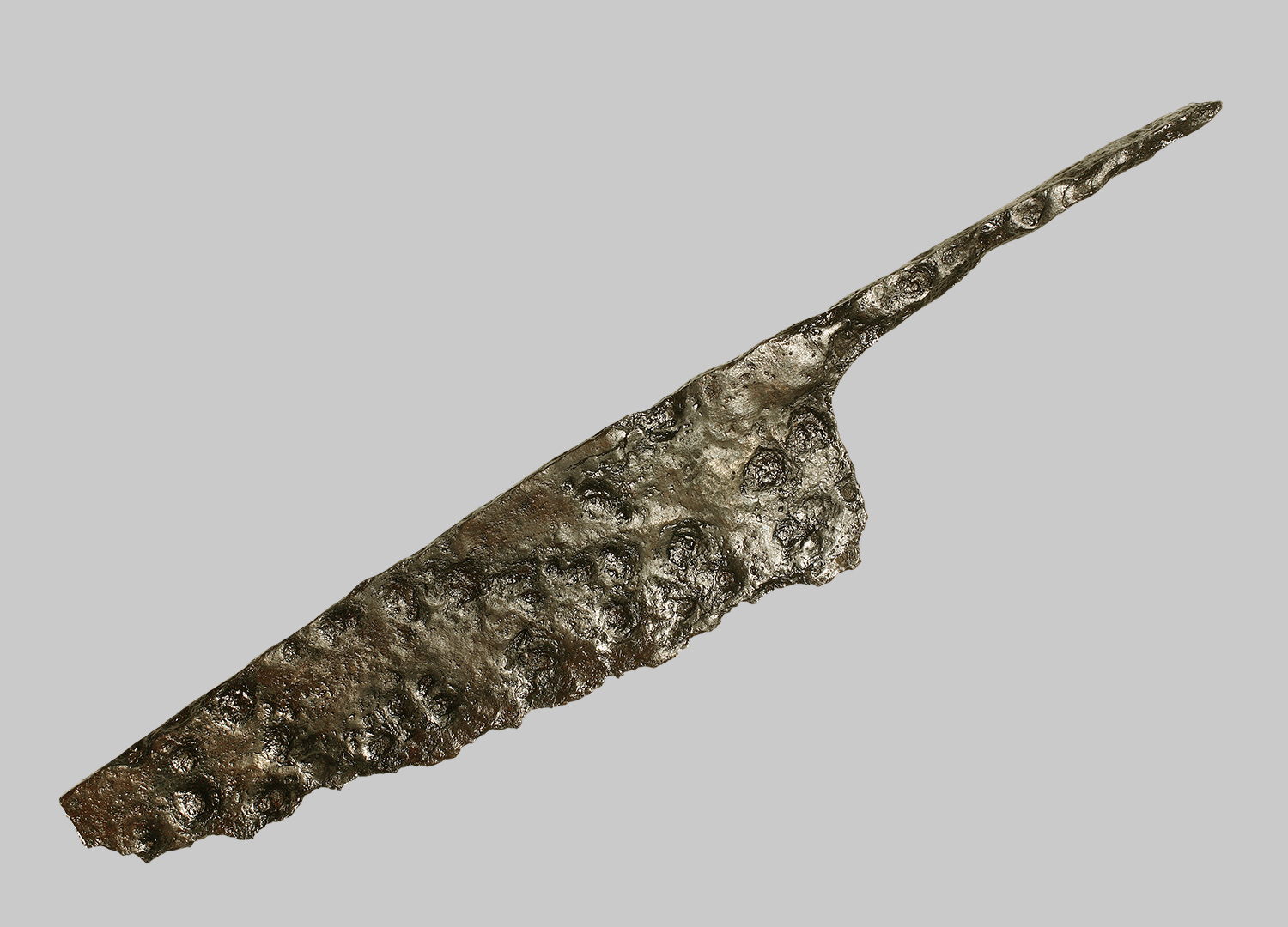 Klingenblatt mit annähernd geradem Rücken und fragmentierter Schneide. Ursprünglich vielleicht Bestandteil einer Schere. Wohl sekundär als Messer genutzt.