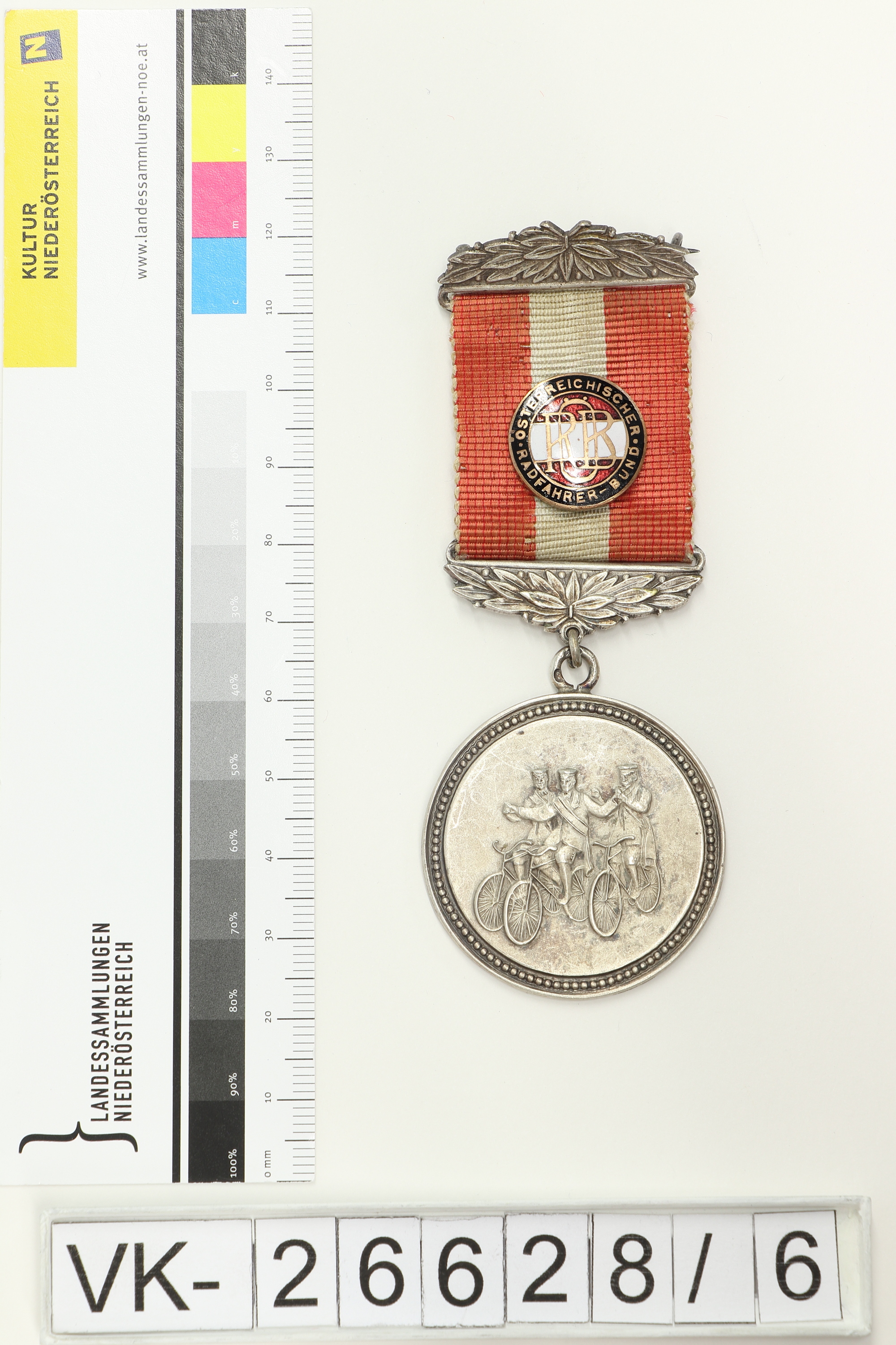 Abzeichen (2. Preis) mit der Darstellung von drei Kunstradfahrern in Formation. Beschriftungen: "ÖSTERREICHISCHER RADFAHRER_BUND", MEISTERSCHAFT v. ÖST. SECHSER-KUNSTREIGEN 1931".