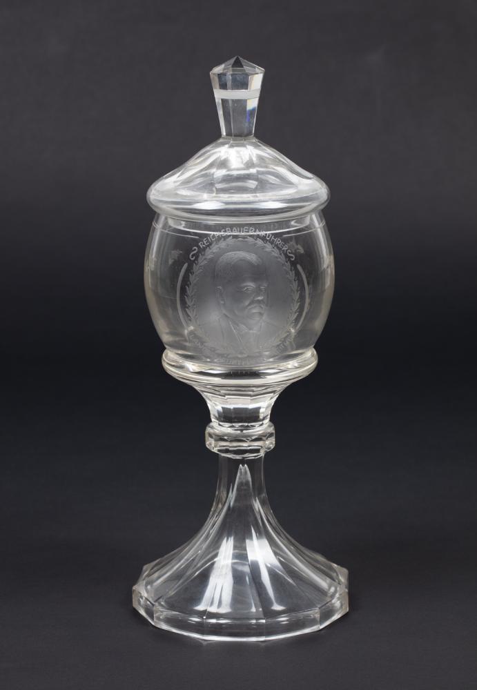 Glasbecher mit Portrait des damaligen Landeshauptmann Josef Reither, dem Emblem des NÖ Bauernbundes und Gravur.