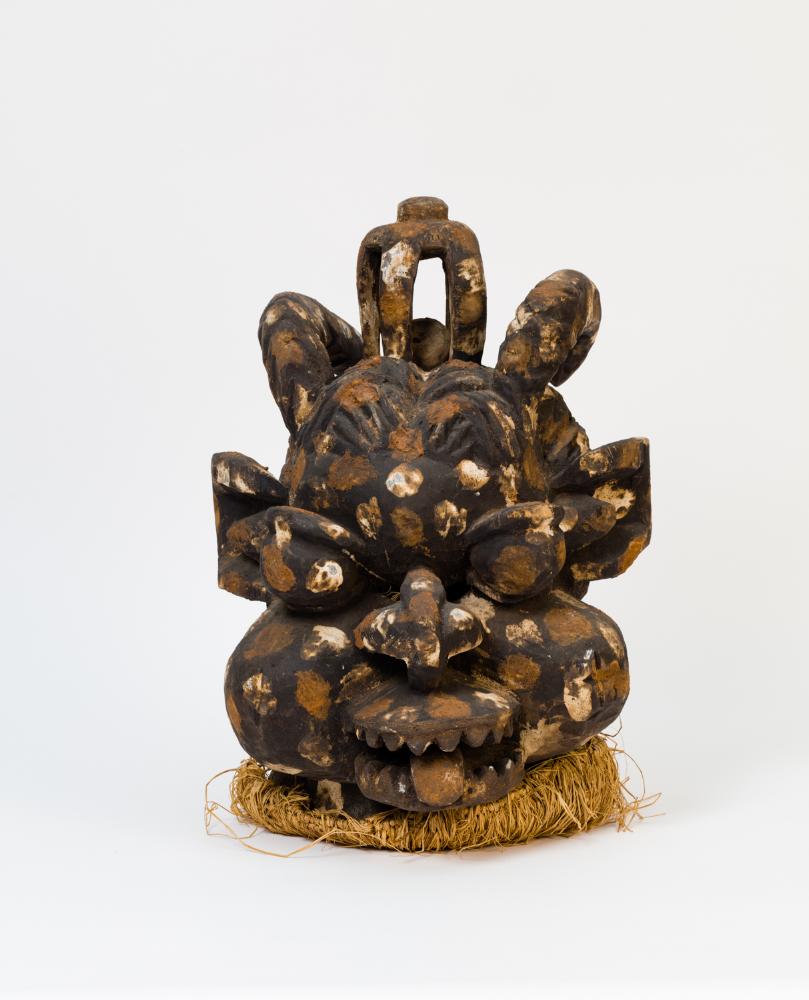 Stülpmaske mit Kragen aus langen Sisalfasern, in Schwarz, Weiß und Rot gefasst. Herkunft Sierra Leone