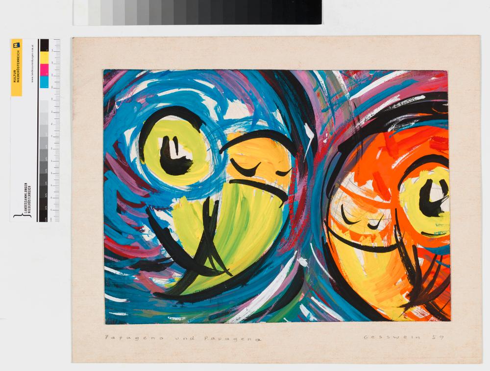 SignaturTrägekarton: VS. li. unten bet., re. unten sign. u. dat.: "Papageno und Papagena, Gesswein 59"