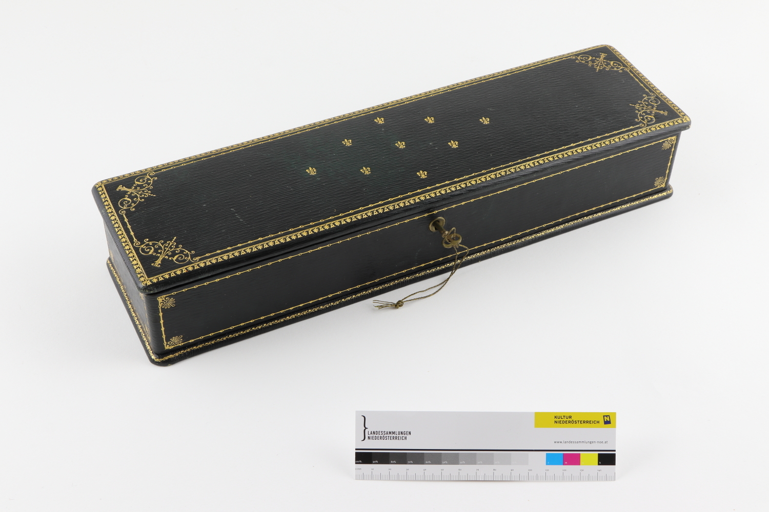 Schwarze Schatulle mit Goldprägung, innen mit blauem Moiré gefüttert. Im Deckel befindet sich eine Lasche mit Handschuhstrecker. Die Schatulle ist mit einem Schlüssel versperrbar.
