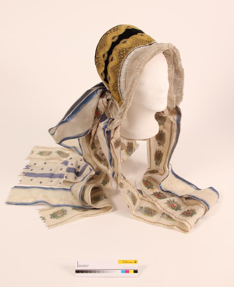 Schwarze Samthaube mit weißer Unterhaube aus Tüllspitze. Gefältelter Haubenboden, der Kopfteil ist mit Goldspitzenborten besetzt. Im Nacken eine doppelte Masche mit langen Bändern, ebenso doppelte Kinnschleifen aus zwei verschiedenen weißen Seidenbändern mit floralem Muster in Rosa/Grün (Rosensträuße) und mit blauen Randstreifen und Pikots. Braun/weißes Baumwollfutter mit geometrisch-floralem Muster. Der weiße Rüschenteil ist aus plissierter Tüllspitze mit Drahtgestänge verstärkt. Der Kopfteil der Unterhaube ist mit weißem Leinen, der Rüschenteil mit Drahtgestänge verstärkt. Im Nacken Weiße Seidenmasche und Bänder mit blaume Mittelstreifen und seitlich kleinen Blümchen.