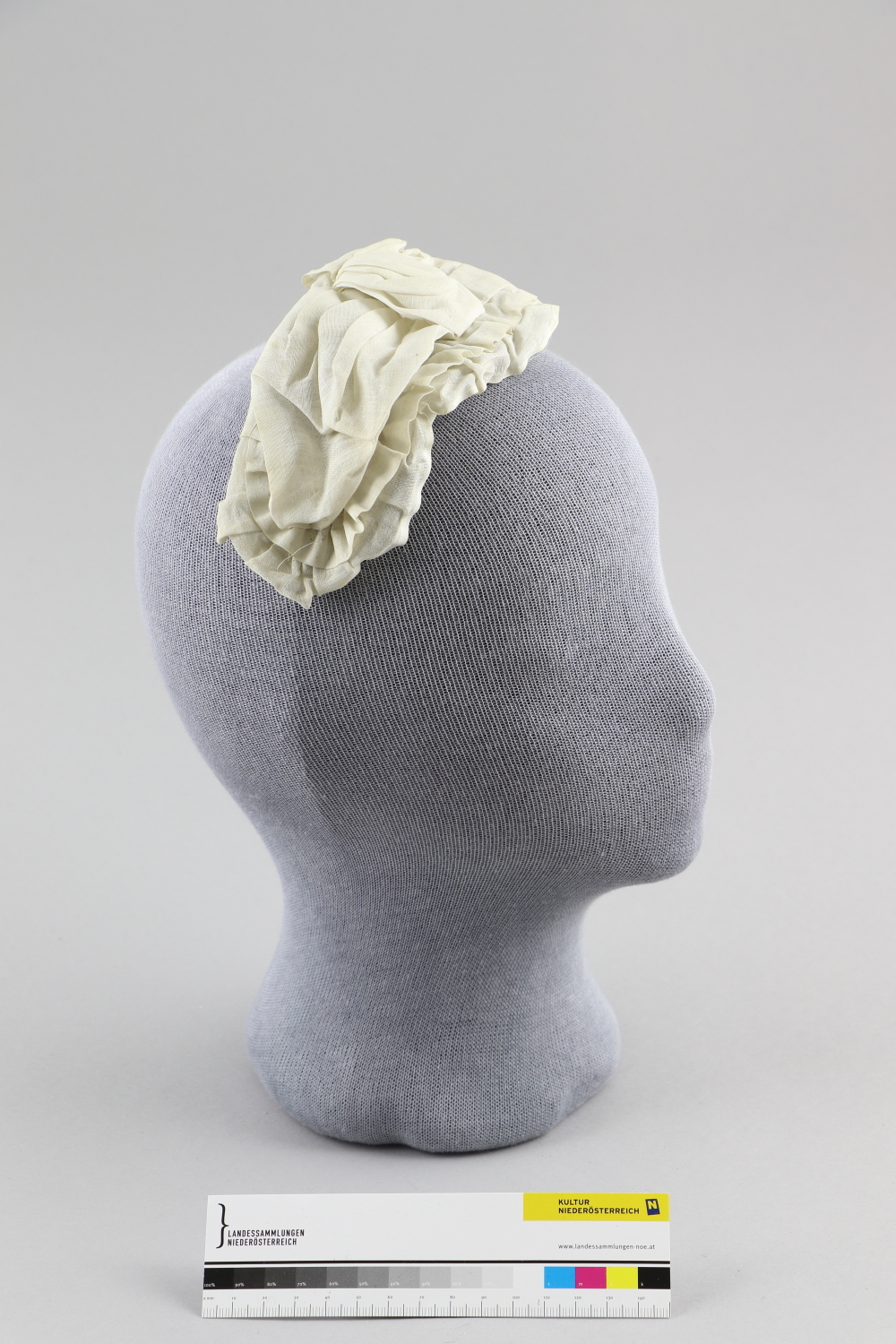 Weißer Kopfputz für Stubenmädchen, umlaufend gefältete Rüschen, mittig eine Schleife mit Steg auf beschichteterm Gitterstoff aufgearbeitet, die Kanten Draht verstärkt.