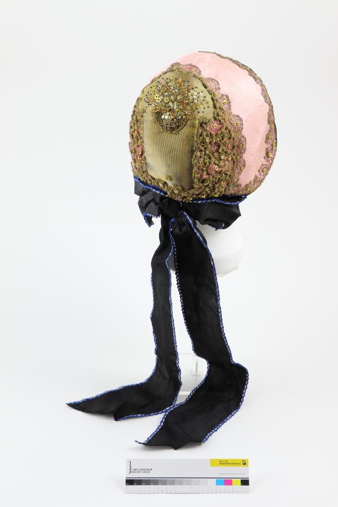 Rosafarbene Bodenhaube, Kopfteil schmal durchgenäht und mit goldener Häkelspitze, Pailletten und Glasperlen bestickt und mit schwarzem Samt eingefaßt. Der Haubenboden ist 3-teilig und mit Goldfäden, Pailletten und Glassperlen bestickt. Den goldenen Mittelteil ziert ein Blumenkorb, die Seitenteile haben ein Gittermuster und sind dunkelrosa unterlegt. Im Nacken eine schwarze Seidenmasche mit Bändern, die Kanten sind Blau/Weiß umhäkelt. Gelbes Futter mit eingesticktem Namen "Rabl", der Haubenboden ist teils Kartonverstärkt und wattiert.