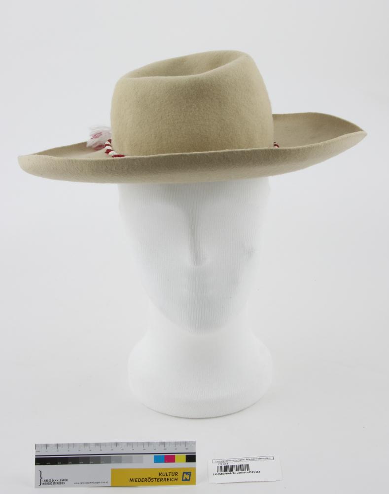 Wollweißer Goralenhut mit breiter, aufgebogener Krempe und rot/weißer Kordel, Schweißband mit Goldprägung und Seidenmascherl, eingenähtes Firmenetikett mit Folienabdeckung, Kopfgröße 54 cm.