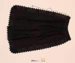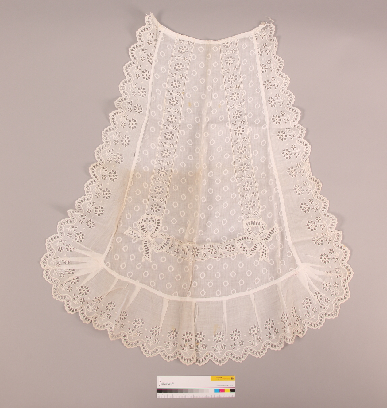 Weiße Schürze aus Leinenbatist mit Einsätzen und Einfasssung in Lochstickerei. Knopf an der linken Seite.