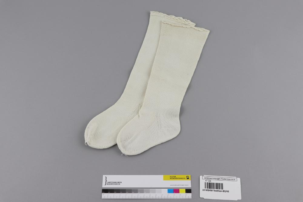 Ein Paar weiße Kinderstrümpfe mit Lochmuster.