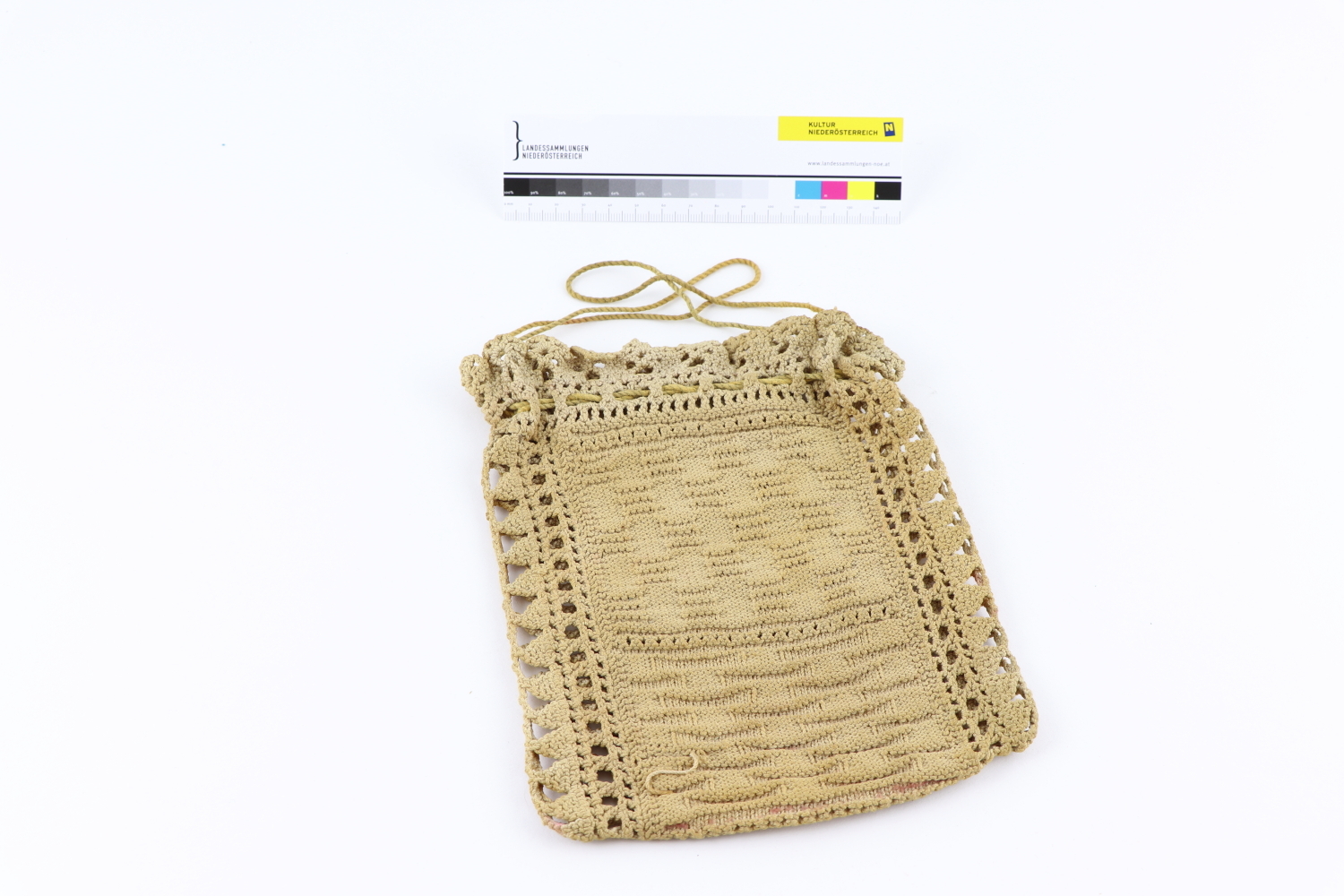 Naturfarbene gehäkelte Tasche mit vier verschiedenen Musterfeldern und Kordel zum Zuziehen.