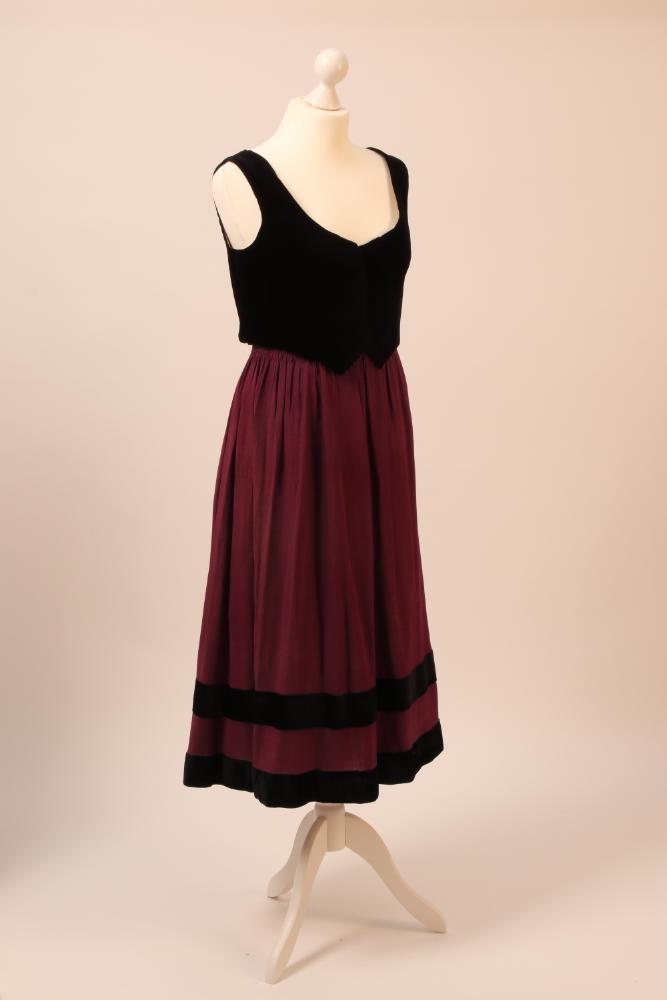 Zweiteilige Mädchentracht mit schwarzem Samtmieder und vilolettem Rock aus Crepe Georgette. Das Mieder hat keinen Verschluß, die Kanten passen nicht zueinander, mit weißem Leinen gefüttert. Der Rock ist eingereiht und mit schwarzen Samtbändern 2-reihig besetzt, Drucker- unud Haftlverschluss im seitlichen Schlitz, vorne links.
