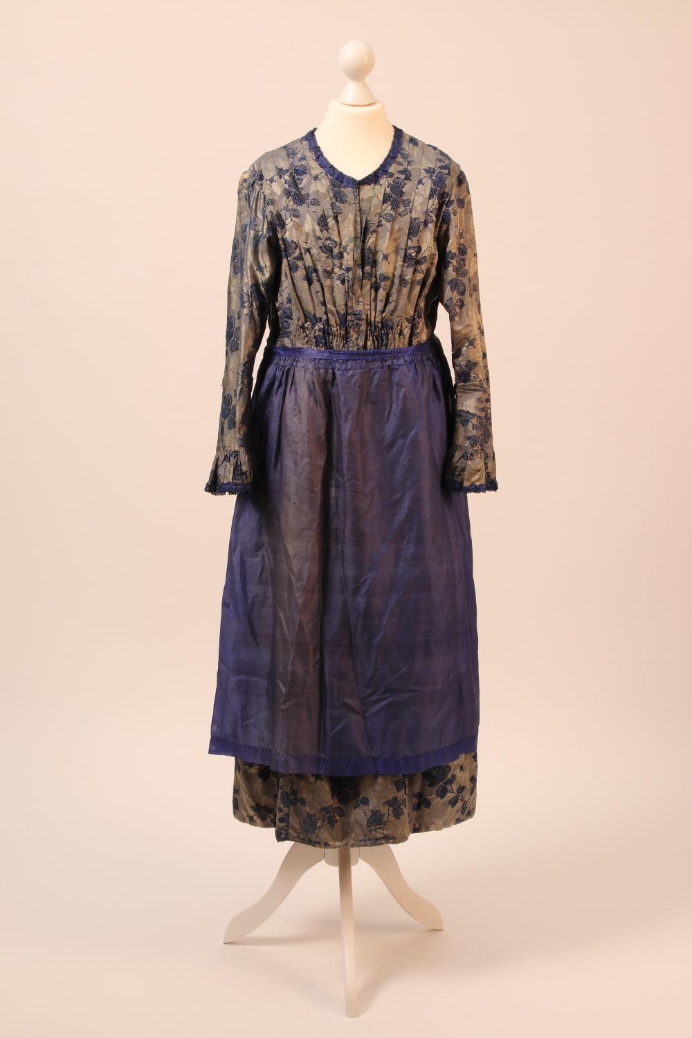 Blau/graues Kleid mit Rosenranken muster, mit Gürtel, Pagodenärmel mit Volant und kleinem V-Ausschnitt, wurde mit einer blauen Seidenschürze zu einer Bürgertracht umgearbeitet. Der Vorterteil ist in der Taille gerafft und an den Schultern in Falten gelegt, Ausschnitt, Ärmelsaum und Gürtel sind mit einer Rüsche aus einem blauen Bändchen besetzt. Im Rock ist unter der Schürze ein Einsatz aus dunkelblauem Rippsgewebe. Oberteil mit naturfarbenem Leinen gefüttert, mit Innenmieder zum Schnüren.