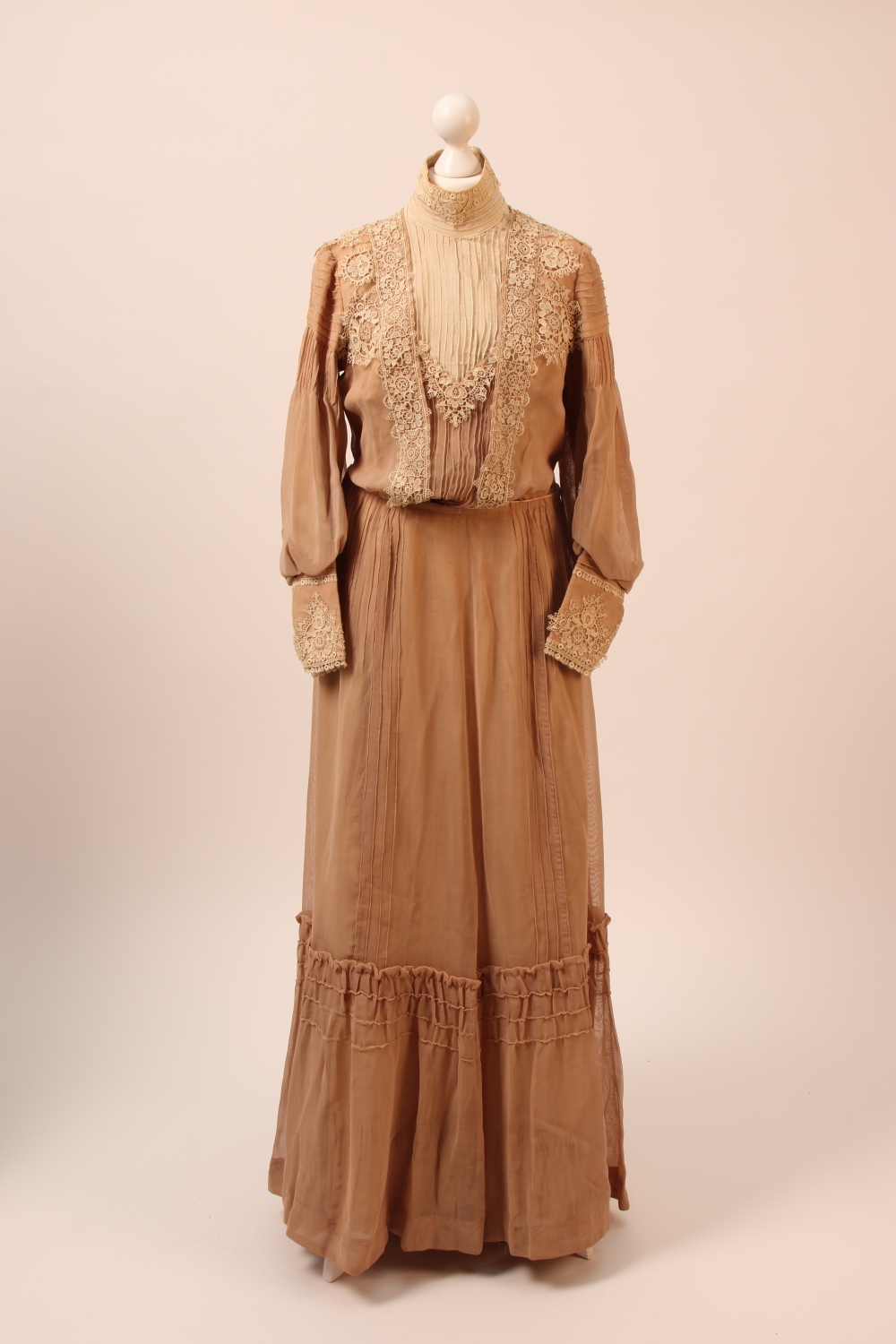 Hochgeschlossenes zweiteiliges Kleid in Ecru mit Manschettenärmeln. Stehkragen, Vorder- und Rückenteil und Manschetten (mit Perlmuttknöpfen) mit weißer Spitze besetzt, Brust- und Rückeneinsatz mit Biesen abgenäht, Druckerverschluß. Weißes Futter mit Innenmieder und Haftlverschluß, mit Fischbein verstärkt, weißes Taillenband mit gesticktem Firmenlogo. Rock mit breitem Volant, gerüscht angesetzt, Taille mit Biesen abgenöht, vorne glatt, weißer Unterrock mit gefältelter Rüschhe besetzt, Drucker- und Haftlverschluss.