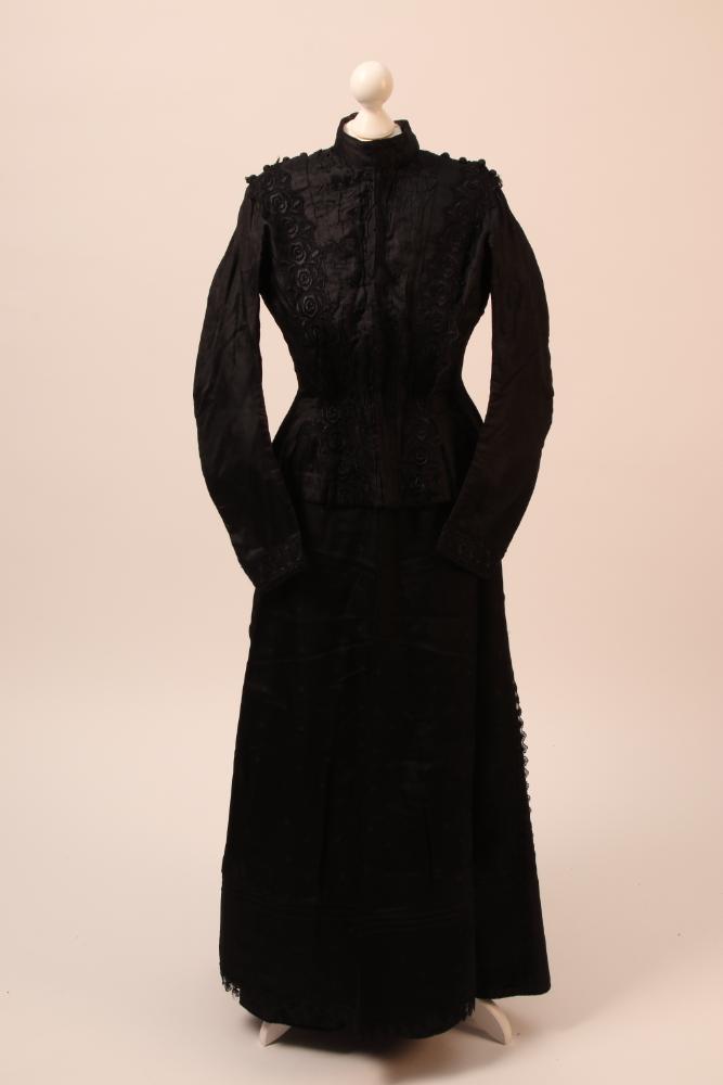 Schwarzes 2-teiliges Kleid, mit Schürze und Tuch als Brautkleid getragen. Taillierte Jacke mit gerüschtem Einsatz und Tüllspitze im Vorderteil, Kugelknöpfe an den Schultern, Stehkragen rückseitig zu schließen, Ärmelbündchen mit Tüllspitze besetzt. Rock mit glatter Vorderseite und abgesteppen, seitlichen Säumchen, Rückenmitte gefältelt, rückseitig mit Tüllspitze besetzt. Seitlich Drucker und Haftlverschluss mit Bindebändchen, mit Gaze gefüttert. Schwarze Schürze in Falten gelegt, umlaufend mit Tüllspitze eingefaßt und drei Säumchen in der Länge. Schwarzes Tuch mit umlaufender floraler Bordüre, zwei Webe- und zwei abgesteppte Kanten, zwei Seiten mit aufwändig geknüpftten Fransen.