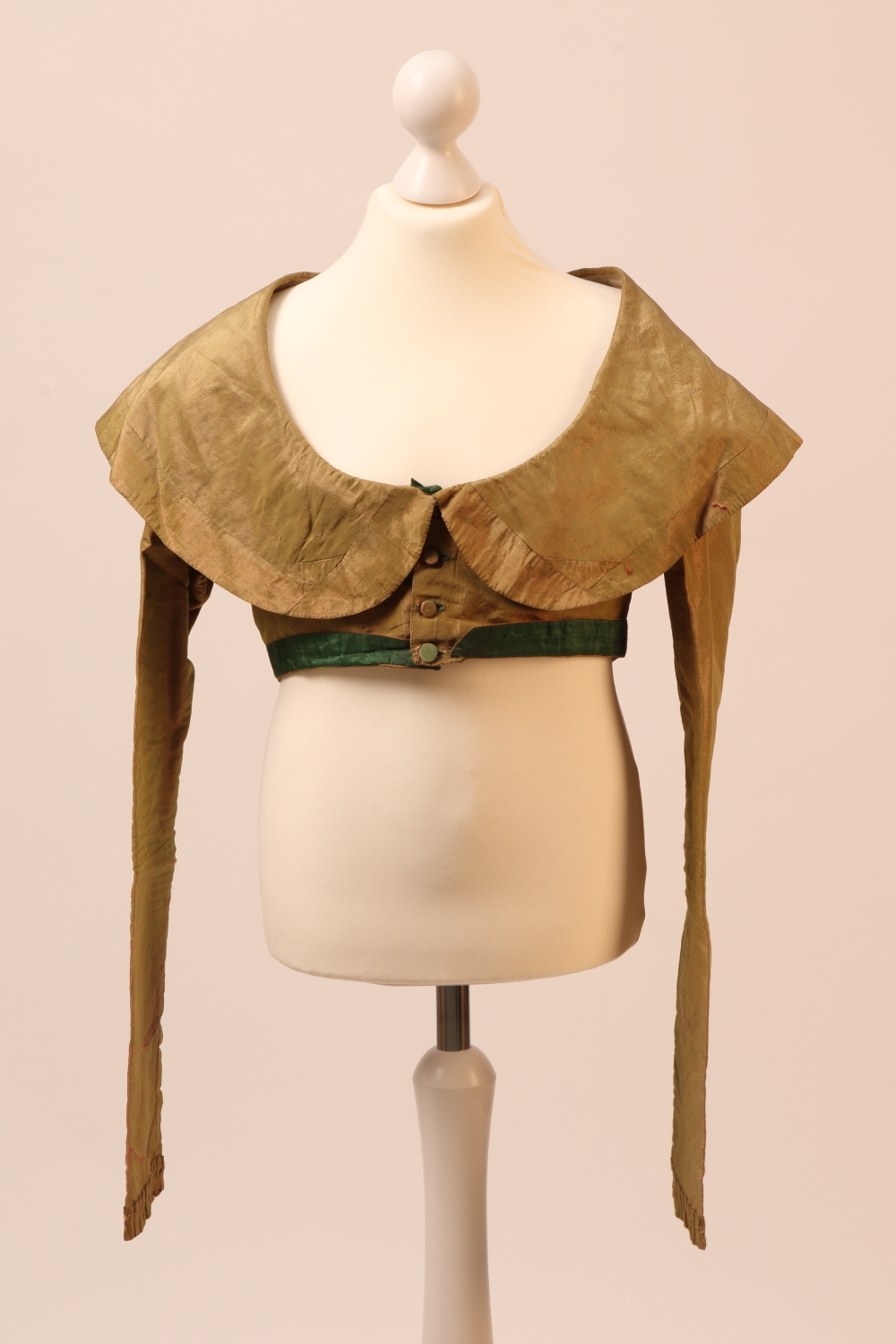 Grün/Rosa changierende Damenjacke in Unterbrustllänge mit großem Kragen und Rüsche am Ärmelsaum. Der Saumaufschlag ist dunkelgrün besetzt und in der Rückenmitte in Stehfalten gelegt. Die Jacke wird mit überzogenen Knöpfen links über rechts verschlossen. Leinenfutter.
