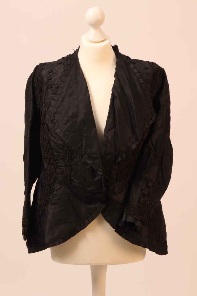 Schwarze, lange Damenjacke mit Posamentierborten besetzt, großer Kragen mit Rüschenabschluß. Am Ärmelsaum überzogene Zierknöpfe, ein großer Posamtierknopf in der Vorderen Mitte mit verdecktem Druckverschluß. Hellblaues Futter mit Bleigewichten im Jackensaum. Der Schnitt wurde verändert.