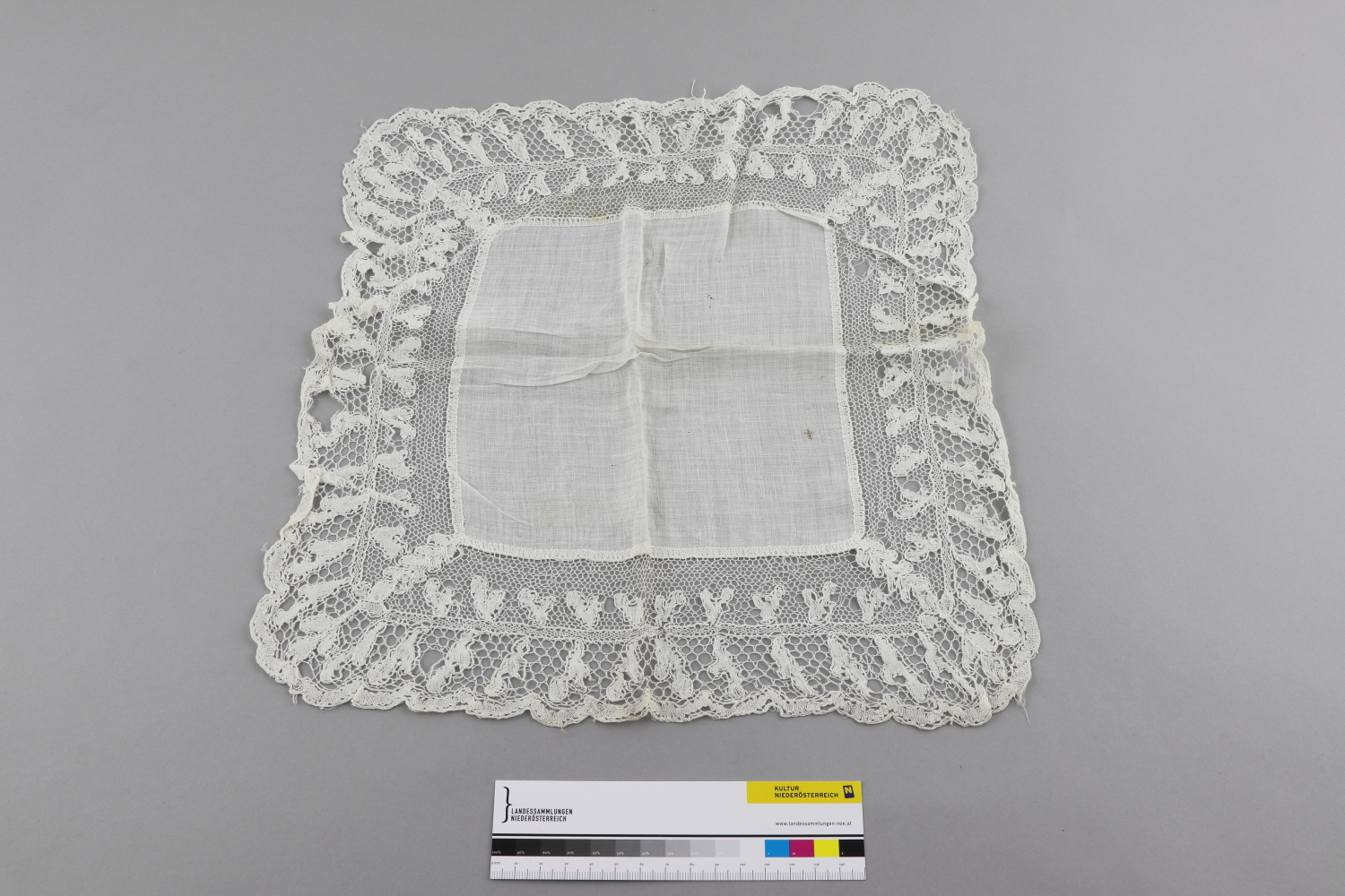 Weißes Taschentuch aus Leinenbatist mit 8 cm breiter Klöppelspitze umsäumt.