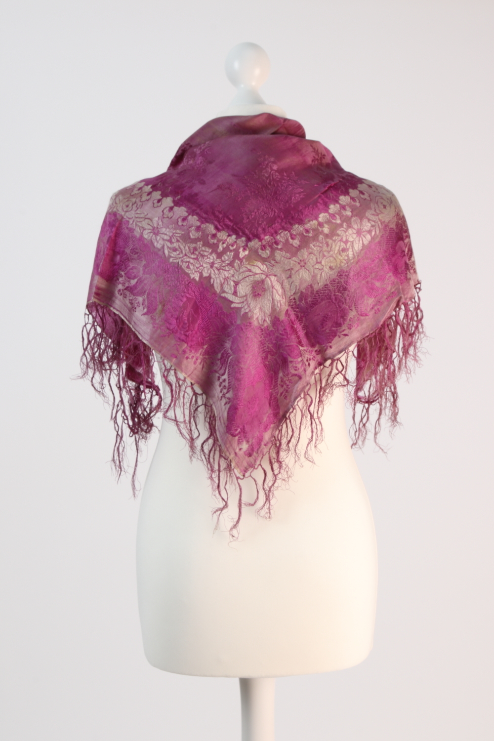 Violettes Tuch mit Blumen- und Rosenmuster und weißer floral-ornamentaler Bordüre, geknüpfte Fransen. Zwei Webe- und zwei umgeheftete Kanten.