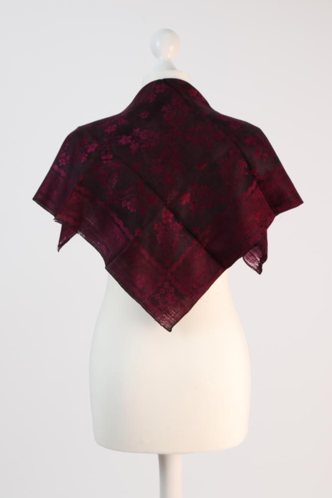 Violettes Schultertuch mit schwarzem Gittermuster aus Blüten- und Blätterranken, umfaufende Bordüre. Zwei Webe- unud zwei rollierte Kanten.
