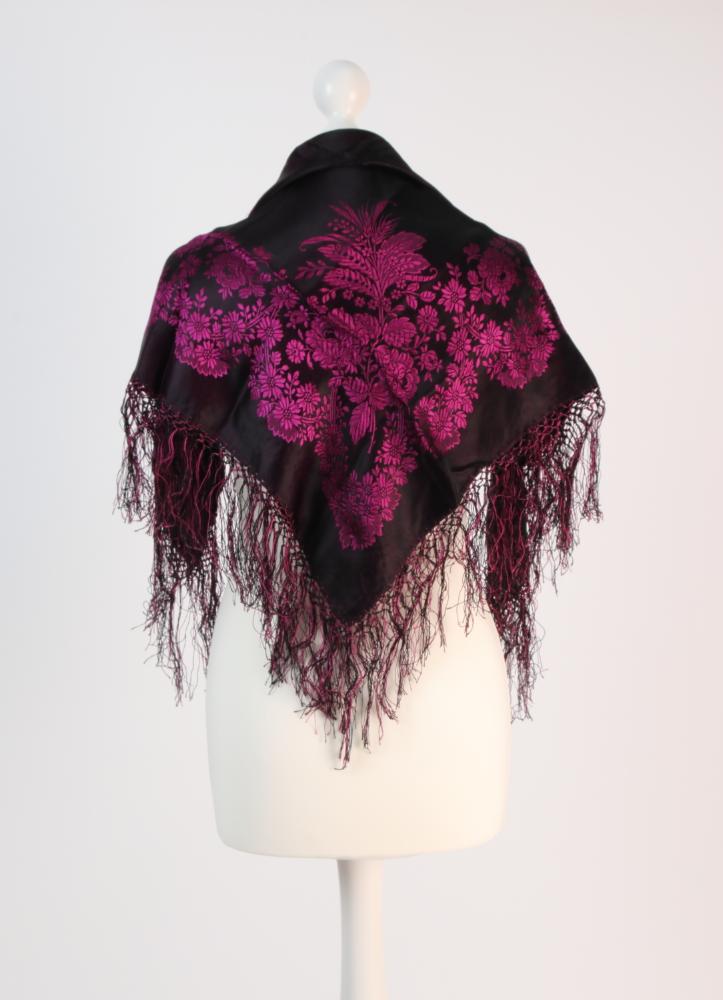 Schwarz/violettes Tuch mit breiter umlaufender Bordüre mit Rosen, Blumen, Ähren, beidseitig zu tragen. Zwei Webe-, zwei abgesteppte Kanten mit geknüpften Fransen in Schwarz/Violett. Zugehörig ein schwarzer Beutel mit Kordelzug.