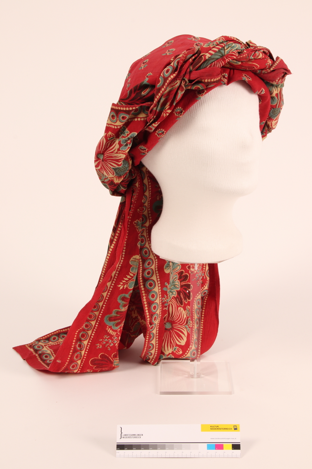 "Sachs" Trachten Kopftuch aus bedruckten Leinen mit rotem Blumenmuster.