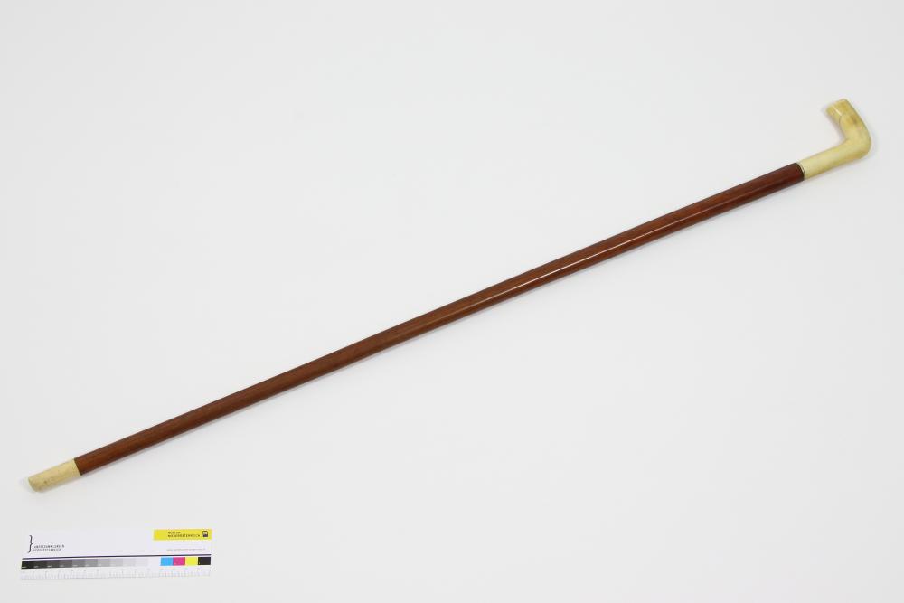 Brauner Gehstock mit Spitze und L-förmigem Griff aus Bein, Metallring zwischen Griff und Stock.