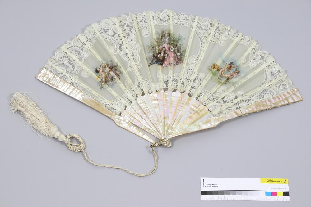 Weißer Spitzenfächer mit szenischen Darstellungen auf Organza, mittig ein Liebespaar, seitlich je zwei Putten. Stäbe aus Perlmutt, ebenso die Augen am Dorn, weiße Kordel mit Quaste und Ring. Zugehörig Unterteil einer Schachtel, innen Etikett eingeklebt.