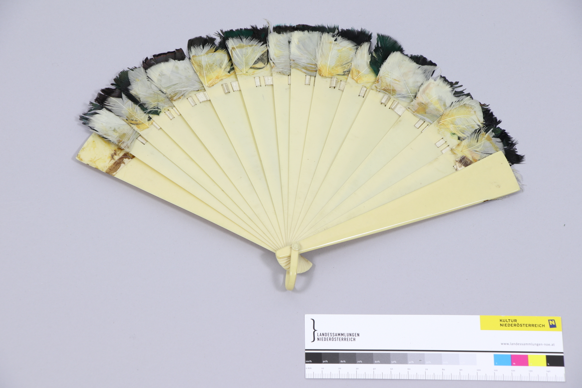 Weißer Fächer mit schwarz/grünen und weißen Federn an der Oberkante besetzt.