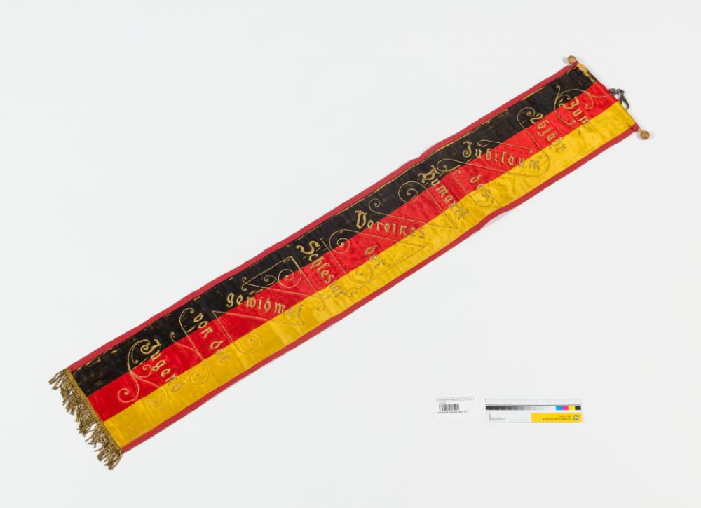 Schwarz/rot/goldenes Fahnenband mit Schriftzug und Relief-/Schnurstickerei in Gold, Unterkante mit goldener Fransenborte besetzt. Rot hinterfüttert mit angenähtem Firmenetikett, hölzerne Querstange und Karabiner für die Montage.