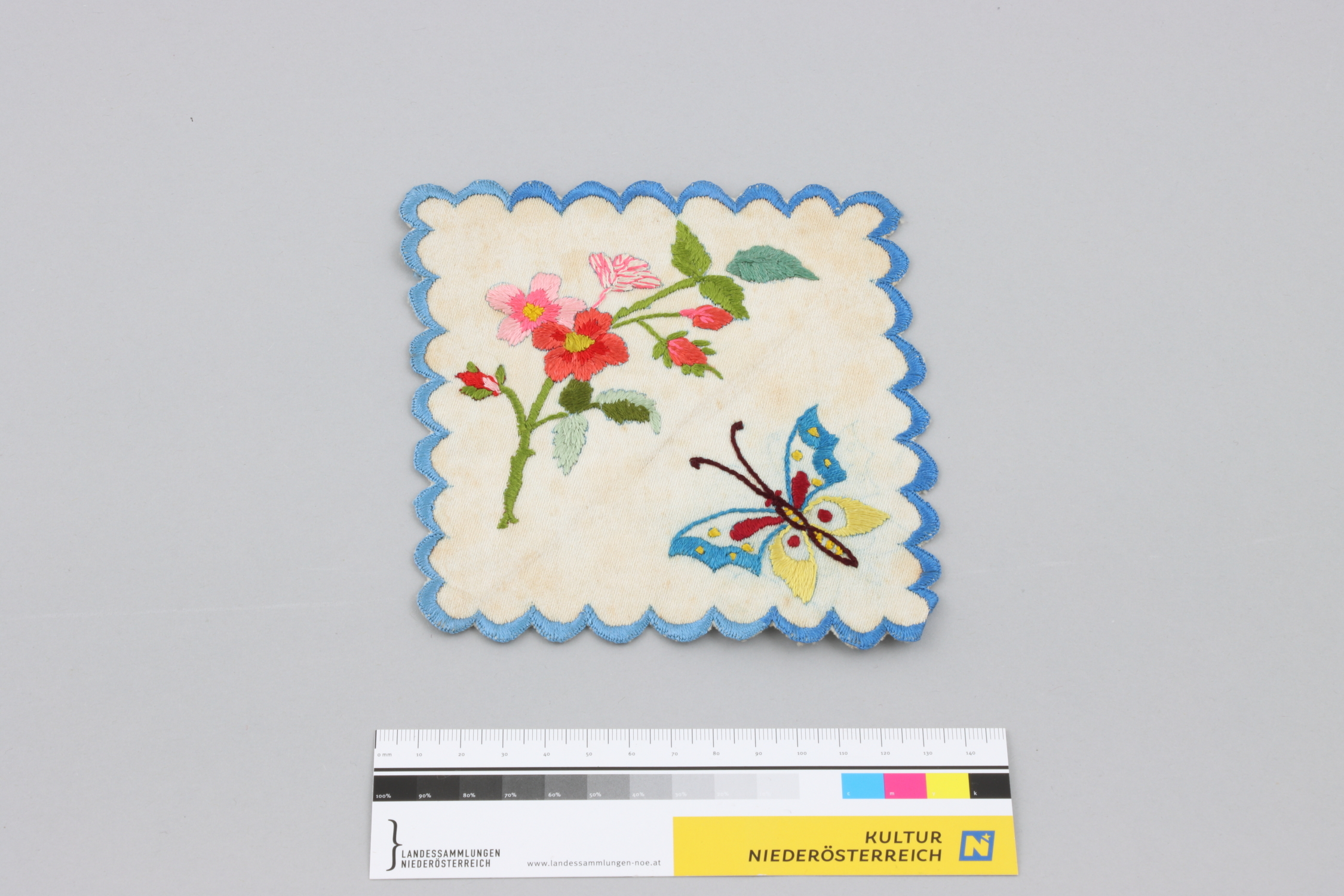 Weißes Zierdeckchen mit buntem Blütenzweig, Schmetterling und blauem, gebogtem Rand gestickt.