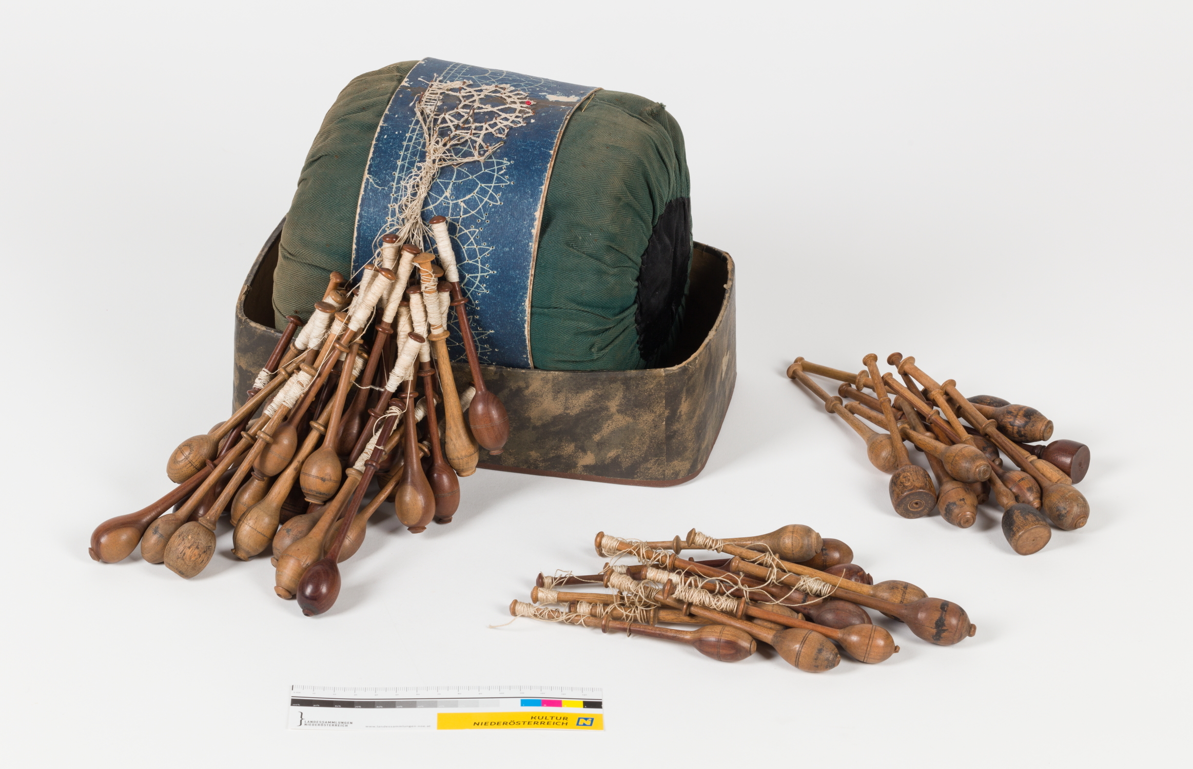 Grüner Klöppelpolster mit angefangener Arbeit auf Klöppelbrief festgesteckt, der Polster sitzt auf einer mit Papier überzogenen Kartonschachtel. Beiligend ein Gedicht, 13 Holzklöppel mit und 13 Holzklöppel ohne aufgewickeltem Leinengarn.