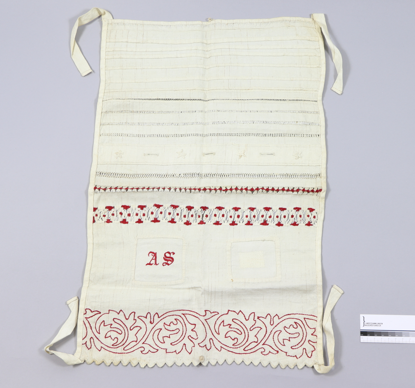 Weißes Stickmustertuch, teilweise rot bestickt, Säumchen und Ajour- und stickerei, an den Ecken angenähte Bänder, Zwirnknöpfe, Monogramm "AS".