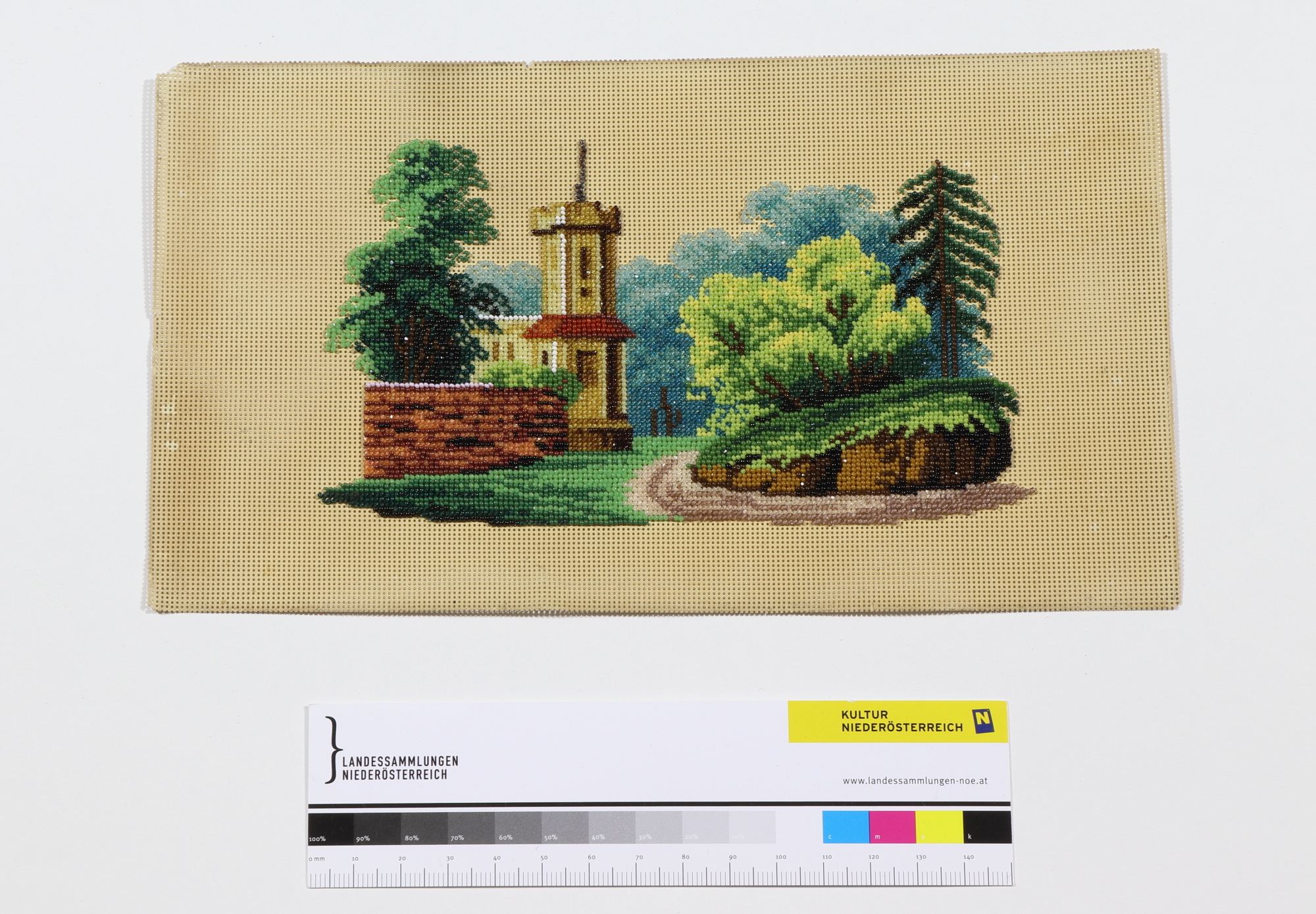 Stickbild aus Glas- und Metallperlen auf Lochkarton. Dargestellt ist ein Gebäude mit Turm in einer Parklandschaft.