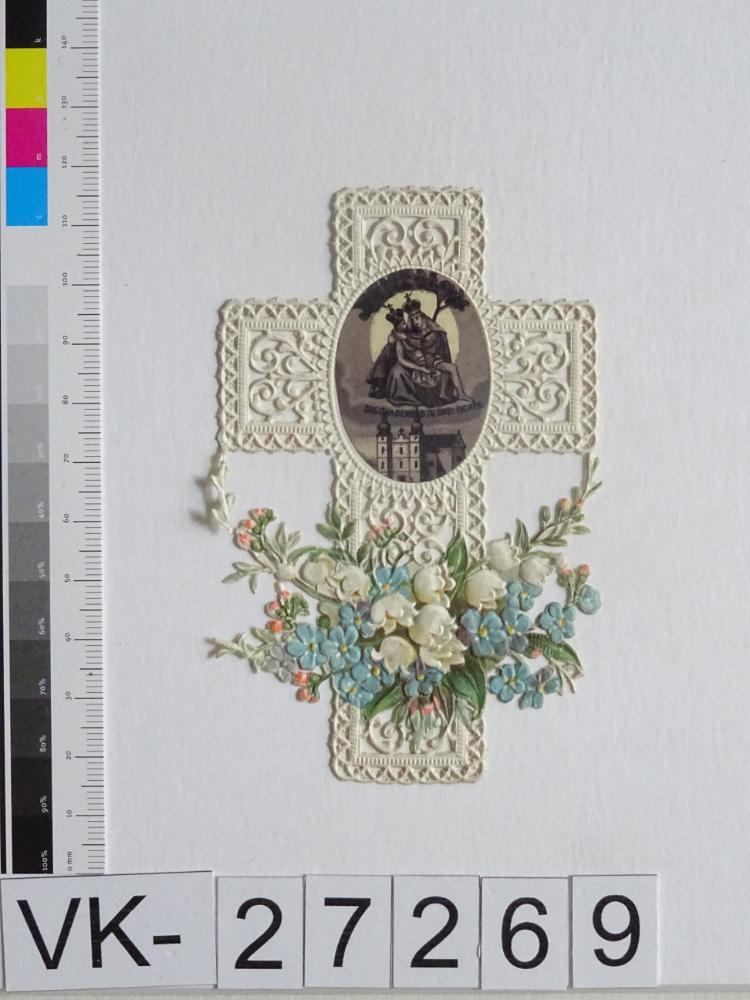 Maria Dreieichen; Vorderseite: Gnadenstatue = Pietà, Basilika, Blumen /Maiglöckchen, Vergissmeinnicht); Rückseite: "Gebet"; Bildchen in Form eines Kreuzes