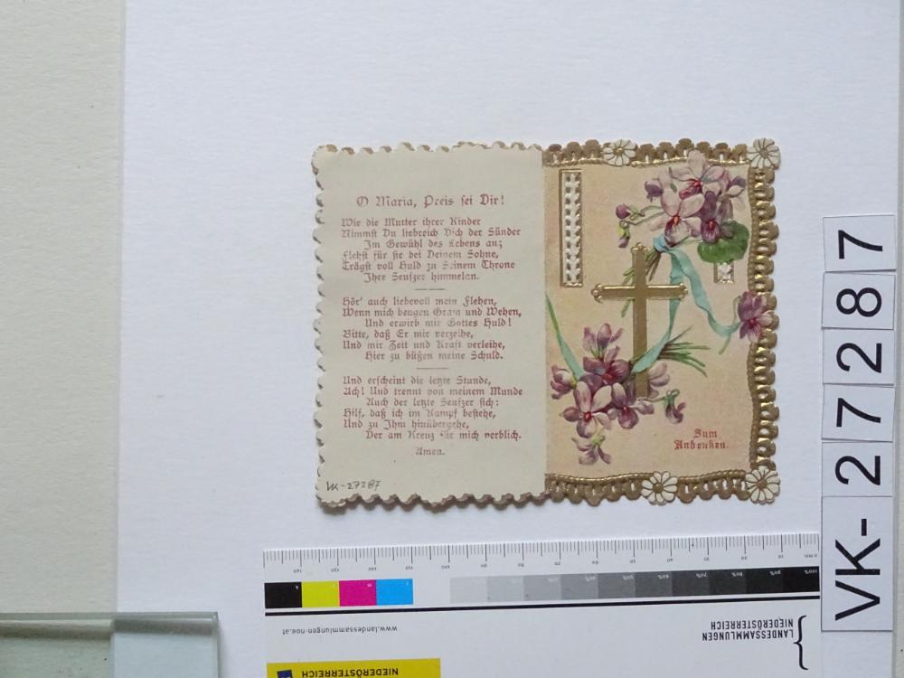 Maria Dreieichen; gefaltet; Vorderseite: Kreuz, Blumen (Veilchen); Innenseiten: Gnadenstatue = Pietà, Basilika, "Gebet"; Rückseite: Gebet "O Maria, Preis sei Dir"