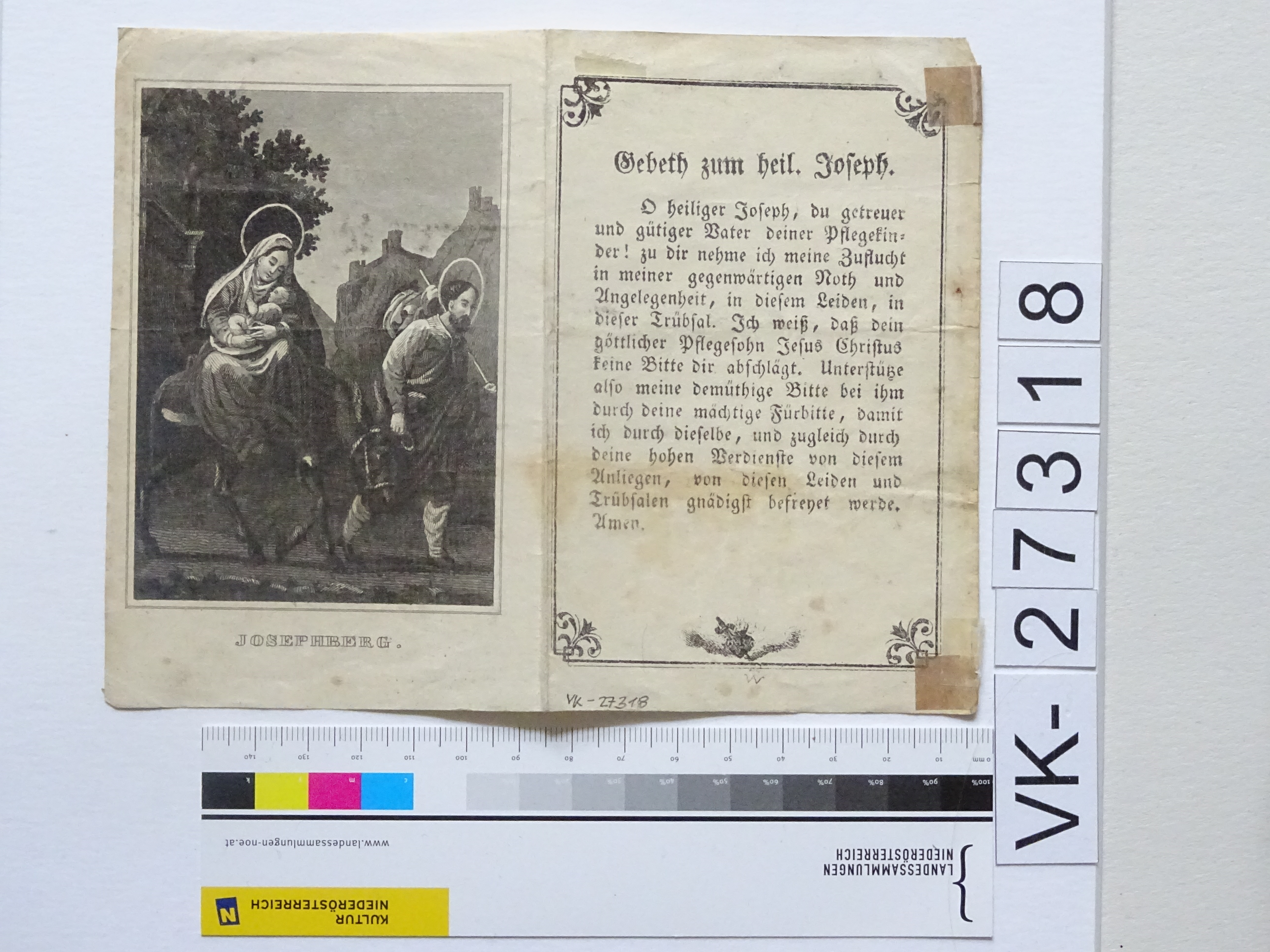 Josefsberg bei Mitterbach am Erlaufsee; gefaltet; Vorderseite: Gnadenbild = Flucht nach Ägypten (Maria, Jesus, Josef, Esel); Innenseite: monogrammiert "F W"; Rückseite: "Gebeth zum heiligen Joseph", monogrammiert "F W"