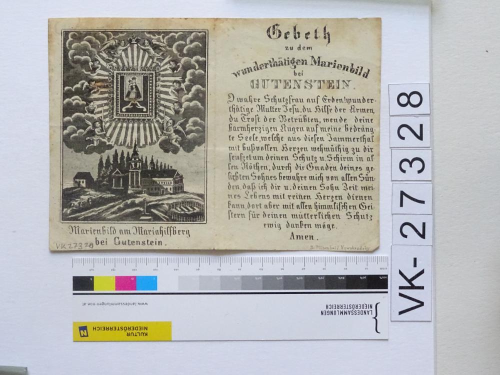 Mariahilfberg bei Gutenstein; gefaltet; Vorderseite: Gnadenbild = Maria mit Kind, Wallfahrtskirche; Innenseiten: handschriftlich "Johanna xxx (Name unleserlich) 1877"; Rückseite: "Gebeth zu dem wunderthätigen Marienbild bei Gutenstein", "St. Pölten b. J.