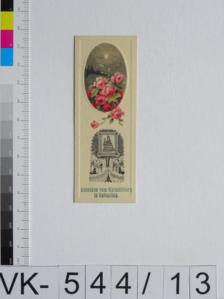 Mariahilfberg bei Gutenstein; Vorderseite: Gnadenbild = Maria mit Kind, Wallfahrtskirche, Blumen (Rosen); Rückseite: "Gebet"