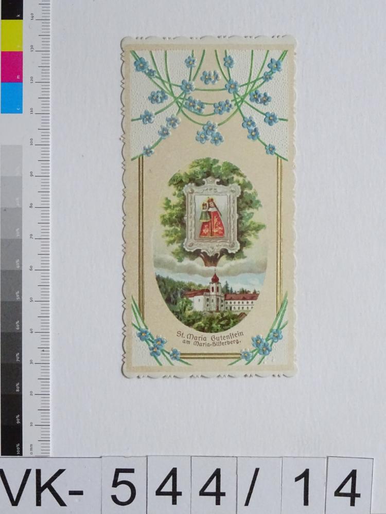 Mariahilfberg bei Gutenstein; Vorderseite: Gnadenbild = Maria mit Kind, Wallfahrtskirche, Blumen (Vergissmeinnicht); Rückseite: Gebet "Zu Maria geh`!", "Verlag F. J. Schadek, Wien"