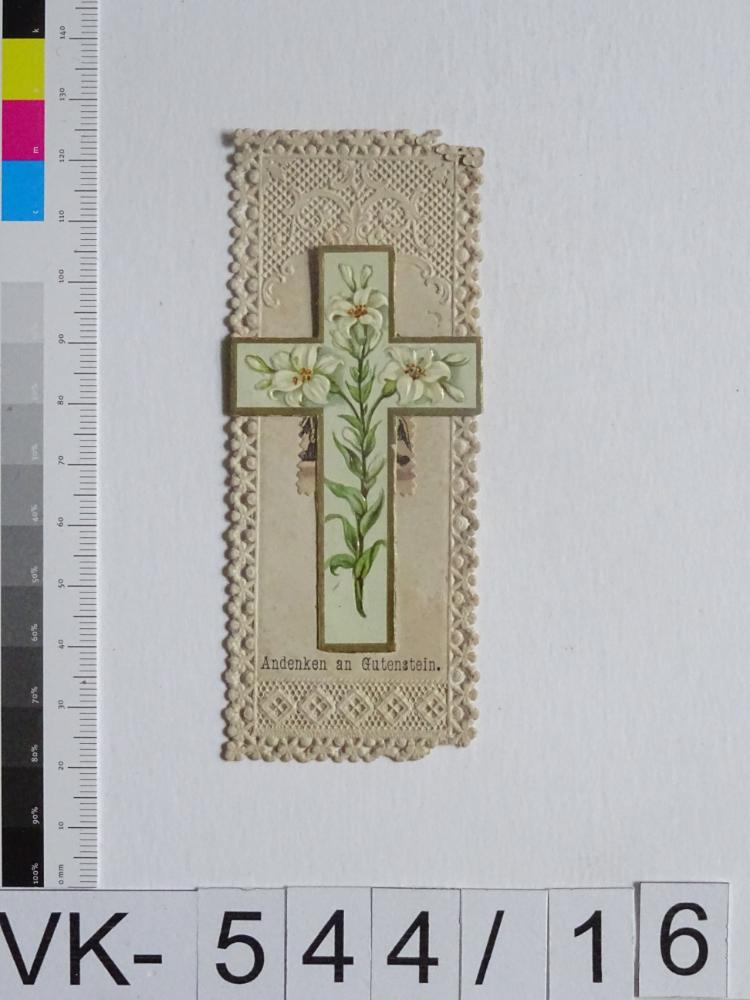Mariahilfberg bei Gutenstein; aufklappbar; Vorderseite: Blumen (Lilien), Kreuz=zum Wegklappen; darunter: Gnadenbild = Maria mit Kind, Wallfahrtskirche; Rückseite: "Gebet", "Franz Schemm, Nürnberg"