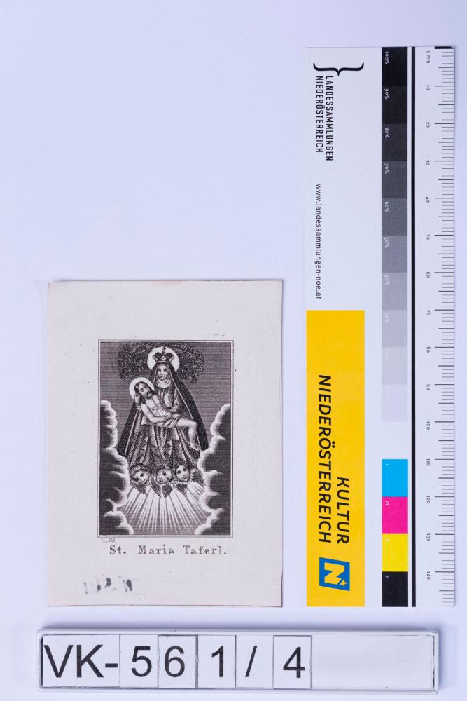 Maria Taferl; Vorderseite: Gnadenstatue = Pietà, Basilika, "M. Taferl bey A Preslitzk.." (Rest unleserlich, da beschnitten); Eintrag Inventarbuch: "Heiligenbildchen Maria Taferl, alt; Siehe II 6556"